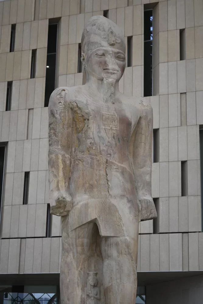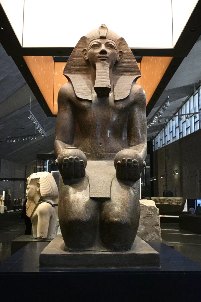 V notranjosti muzeja je obiskovalec nemudoma soočen z 3200 let starim kipom Ramzesa II., ki tehta več kot 80 ton. Na poti v razstavne prostore pa preči tudi veliko stopnišče, ki poleg svoje monumentalnosti nagovarja tudi z ogromnimi kipi božanstev in kraljevih družin. Bogata vsebina muzeja, ki je postavljena na površini približno 90 tisoč kvadratnih metrov razstavnih prostorov, velja za največjo samostojno predstavitev katerekoli stare civilizacije na enem mestu.eo.
