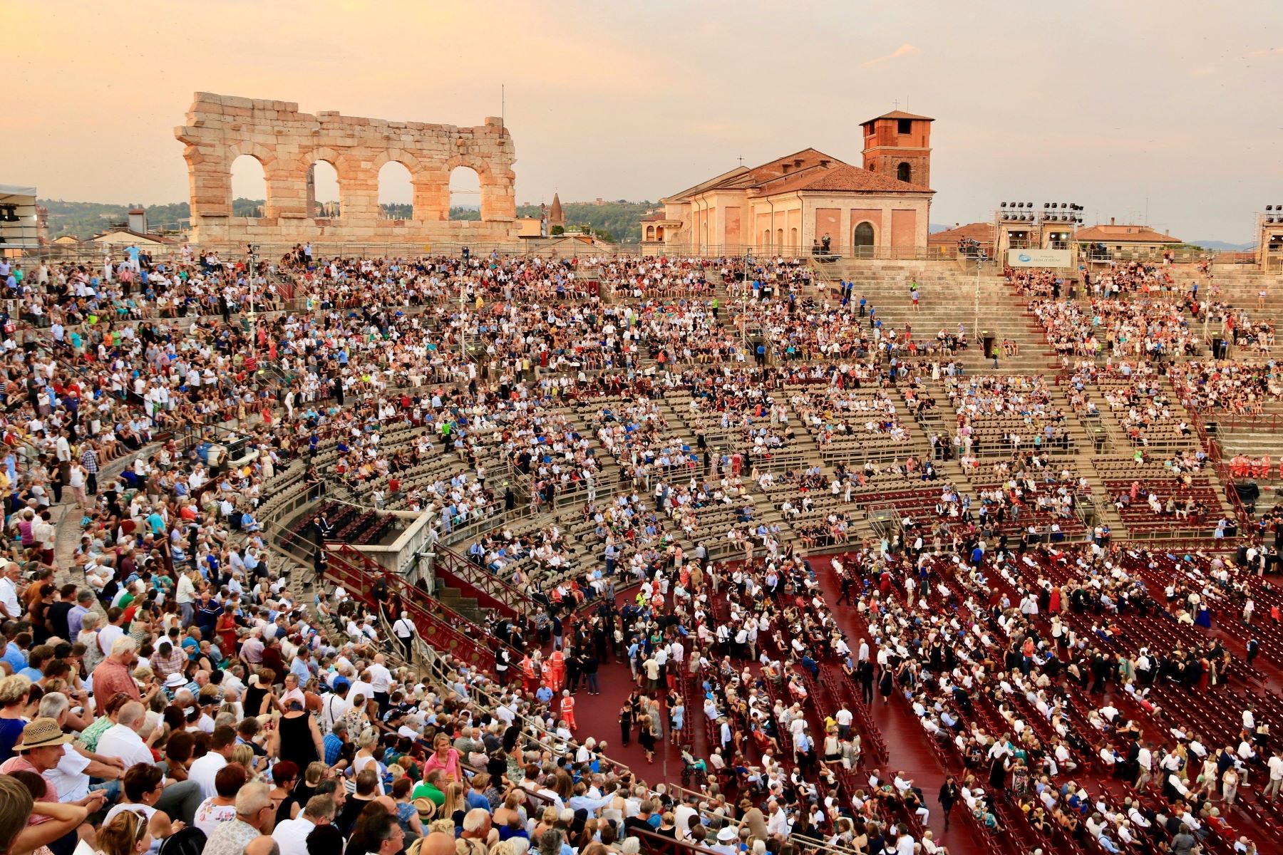 Rimski amfiteater iz prvega stoletja po Kr. velja za enega izmed najpomembnejših in najbolje ohranjenih tovrstnih spomenikov. Gledališke predstave v notranjosti arene, ki je nekdaj sprejela okrog 30.000 gledalcev, prirejajo že od 18. stoletja naprej, zgodovina sodobnega opernega festivala pa sega v leto 1913, ko so v areni v spomin na 100. obletnico rojstva skladatelja Giuseppa Verdija izvedli njegovo znamenito opero Aida. Od takrat je Verona eno izmed najpomembnejših mednarodnih opernih prizorišč, ki vsako leto privabi več kot pol milijona obiskovalcev. V poletnih mesecih festival ljubiteljem opere praktično vsak dan ponudi katero izmed priljubljenih del tega skladatelja.