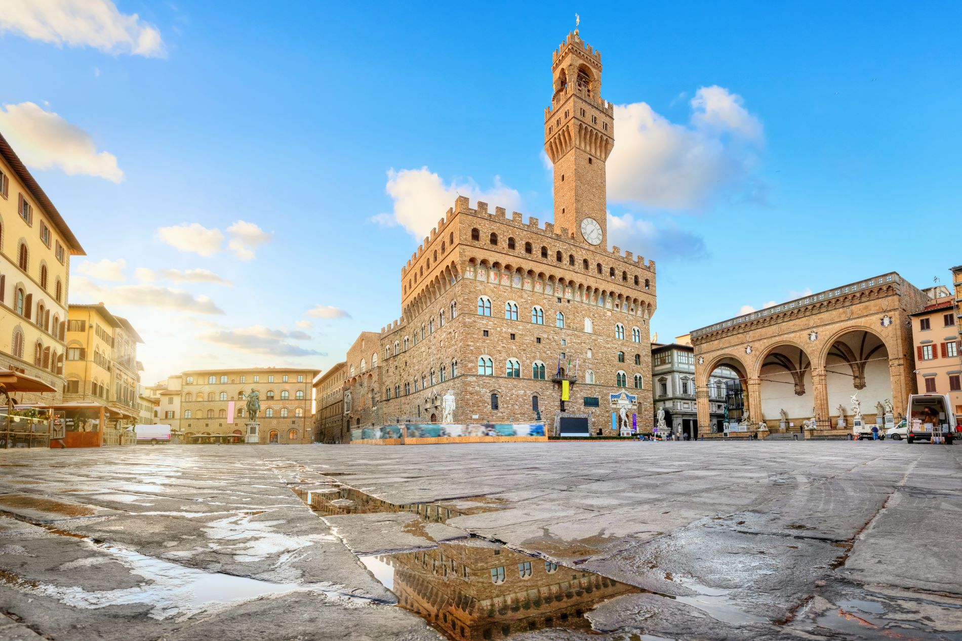 Po zajtrku ogled baptisterija, ki ga krasi eden najlepših mozaikov v Italiji. Na osrednjem trgu Piazza della Signoria si bomo od zunaj ogledali najpomembnejše spomenike. Palazzo Vecchio s svojo mogočno podobo odseva samozavest florentinskih meščanov. V Loggia dei Lanzi in drugje po trgu stojijo številni kipi nekaterih najpomembnejših florentinskih kiparjev (Cellinija, Giambologne, Ammannatija). Nato bomo obiskali znamenito galerijo Uffizi, ki hrani najimenitnejšo zbirko italijanskega slikarstva na svetu. Že Medičejci so poleg domačih mojstrov (Botticellija, Lippija, Michelangela, Bronzina ...) v galeriji hranili izbrana dela tujih slikarskih šol, sijajno zbirko antičnega kiparstva, miniatur ter del renesančnih kiparjev. Kljub nekaterim sodobnim predelavam je galerija skupaj z izjemnim bogastvom, ki ga hrani, ostala celostna umetnina brez primere. Obiskali bomo še frančiškansko cerkev St. Croce, ki se ponaša s slavnimi Giottovimi freskami ter predstavlja nekakšen panteon, saj v svoji notranjščini skriva grobove pomembnih Florentincev (Galileja, Michelangela, Machiavellija, Rossinija). Posebno pozornost bo pritegnila tudi kapela Pazzi, ki jo je zasnoval Brunelleschi. Povratek proti domu mimo Bologne, Padove in Benetk. Prihod v poznih večernih urah.