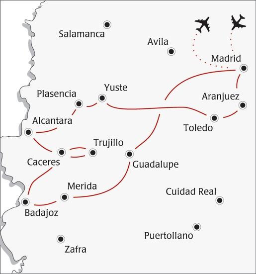 Med velikima metropolama Pirenejskega polotoka, Madridom in Lizbono, se je čas ustavil in skoraj zamrznil očarljiva mesteca, ki vam bodo ponudila podobo, kakršno sta uzrla konkvistadorja Cortes in Pizarro ter cesar Karel V. To je Estremadura, dežela velike krajinske pestrosti in številnih kulturnozgodovinskih spomenikov. Bogastvo srednjeveške arhitekture je osupljivo, a vendar ga prekaša dediščina rimske civilizacije, ki se kaže v veličastnih spomenikih - vrednih samega Rima. Umirjenost, ki se bo naselila v nas že od obiska vrtov, ki obdajajo palačo v Aranjuezu, bo v velikem nasprotju živahnosti Toleda in predvsem Madrida, kjer boste med drugim obiskali sijajne muzejske zbirke in eno od razkošnih palač španskih monarhov.